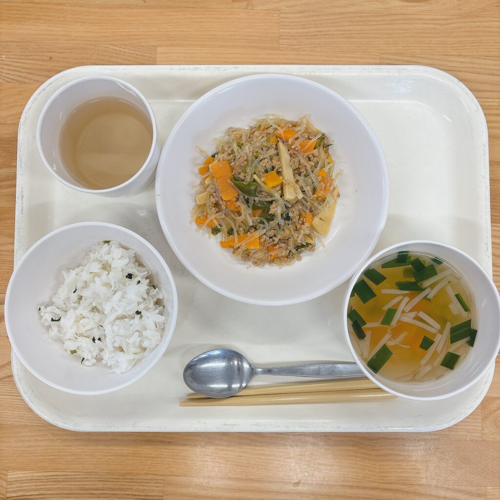 4月7日 (火) 春雨のそぼろ炒め しらす青菜ごはん 今日の献立はどのメニューも美味しいと喜んでくれました。旬の筍も入っており、お野菜がたっぷりのメニューでした。少し苦味を感じるピーマンも美味しいとペロリと食べてくれていました。ニラスープも身体に必要な栄養が満遍なく入っています。 りんごゼリー 4月3日 (金) 前の記事 4月7日(火) 次の記事