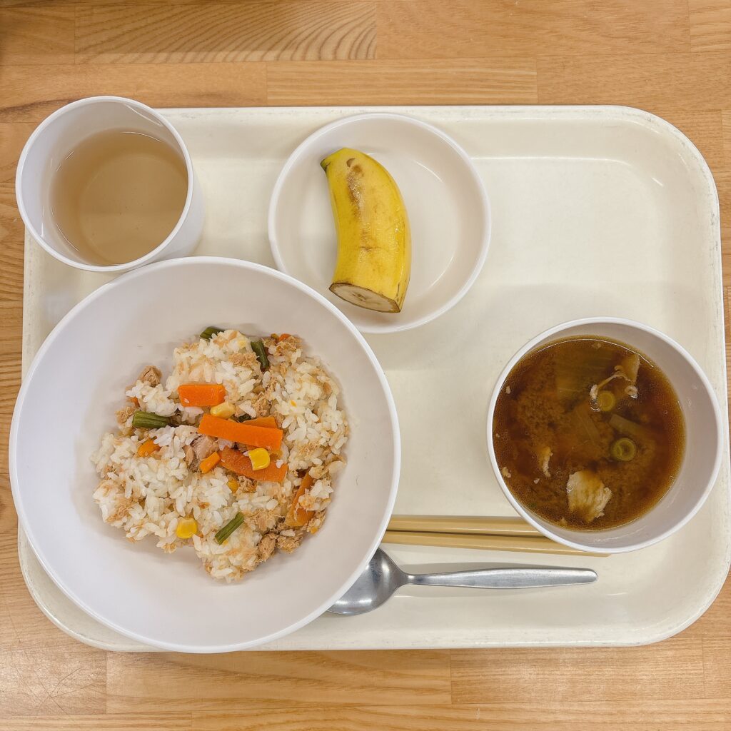今日の豚汁は鰹出汁を取り、里芋、豚肉、人参、玉ねぎ、葉ネギが入っています。里芋の力で腸を整え、人参、葉ネギが免疫力アップにつながり、豚肉、玉ねぎが疲労回復に効果があります。バランスよくサポートしてくれる栄養満点の豚汁です。バナナはどのクラスも大人気でした。