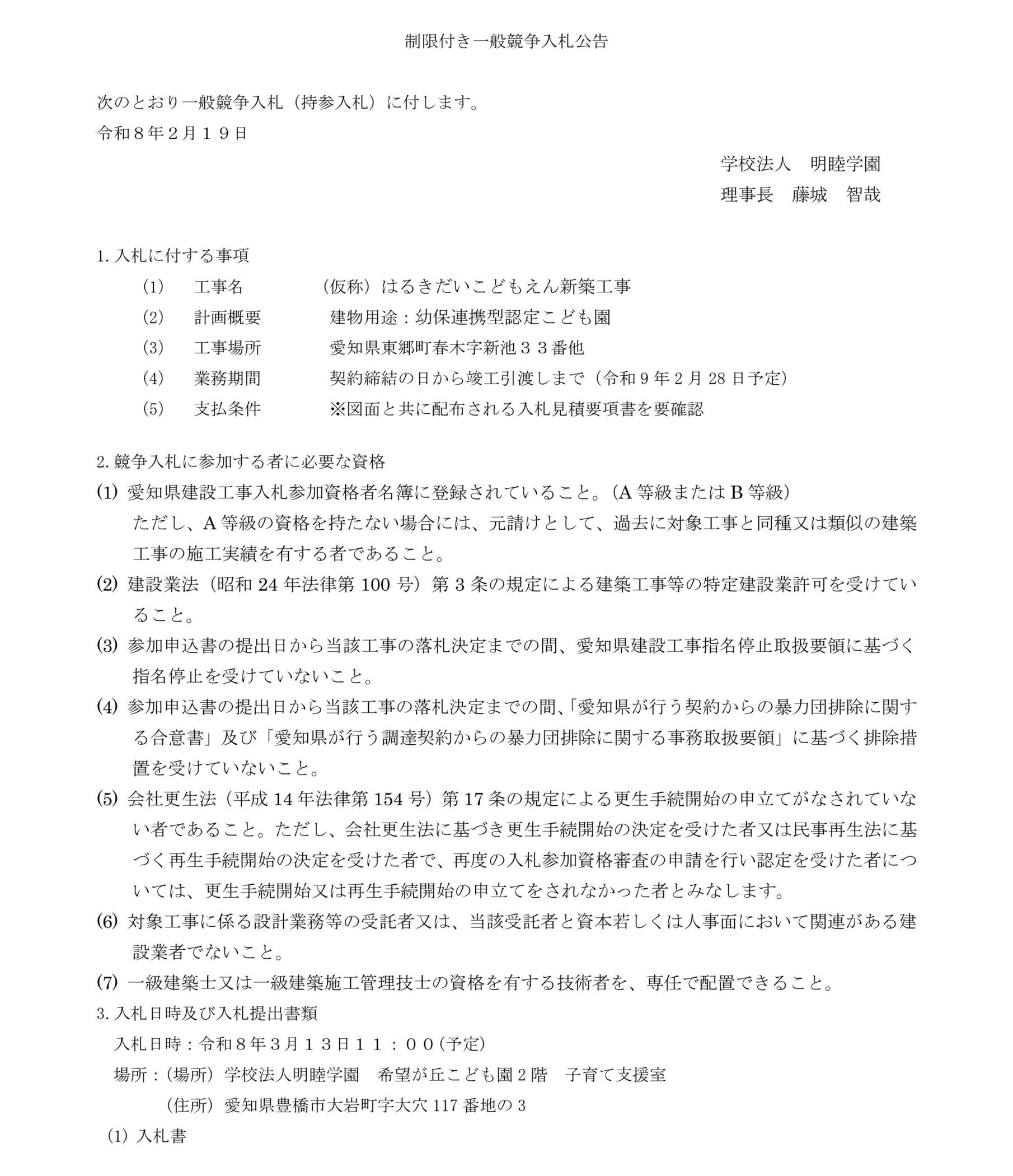制限付一般競争入札公告【(仮称)はるきだいこどもえん新築工事】 入札公告はこちら 制限付一般競争入札公告(仮称)はるきだいこどもえん新築工事 資料PDFダウンロード ※こちらの資料は必ずご確認の上、お申込みください