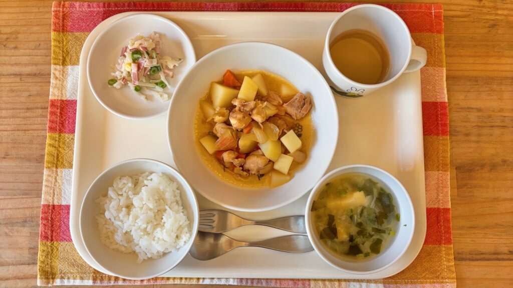今日のメニュー 9月16日(火) ごはん 鶏肉じゃが みそ汁 切り干し大根のサラダ 切り干し大根のサラダは、水で戻し食べやすい大きさに切った切り干し大根を蒸して水にさらし、水気をよく絞ります。いんげん・ベーコンも蒸して、粗熱をとったら切り干し大根と混ぜ合わせ、最後に塩とマヨネーズで味を整えたら完成です。カルシウムや鉄分、食物繊維といった不足しがちな栄養素が豊富に含まれています。 おやつ かぼちゃ蒸しぱん 今日のメニュー 前の記事 今日のメニュー 次の記事