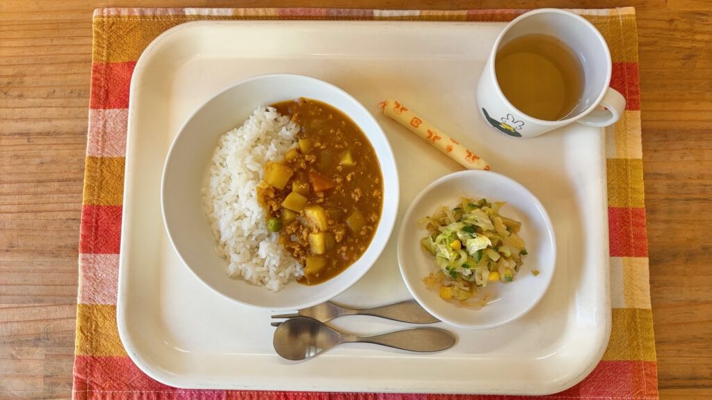 今日のメニュー 9月26日(金) チキンカレーライス 野菜サラダ チーズ カレーのいい香りに誘われて、にこにこでランチルームにやってくる子どもたち。カレーの香りには食欲増進や消化促進の効果があるスパイスが使われています。そして「美味しいカレーが食べたい」と脳を刺激するそうです。むつみで使用するルゥは本格カレーのようなスパイスは入っていませんが「カレーだ!やったー!」と喜び、ぱくぱくもぐもぐと気持ちの良い食べっぷりの子どもたちでした。 おやつ フルーツヨーグルト 今日のメニュー 前の記事 今日のメニュー 次の記事
