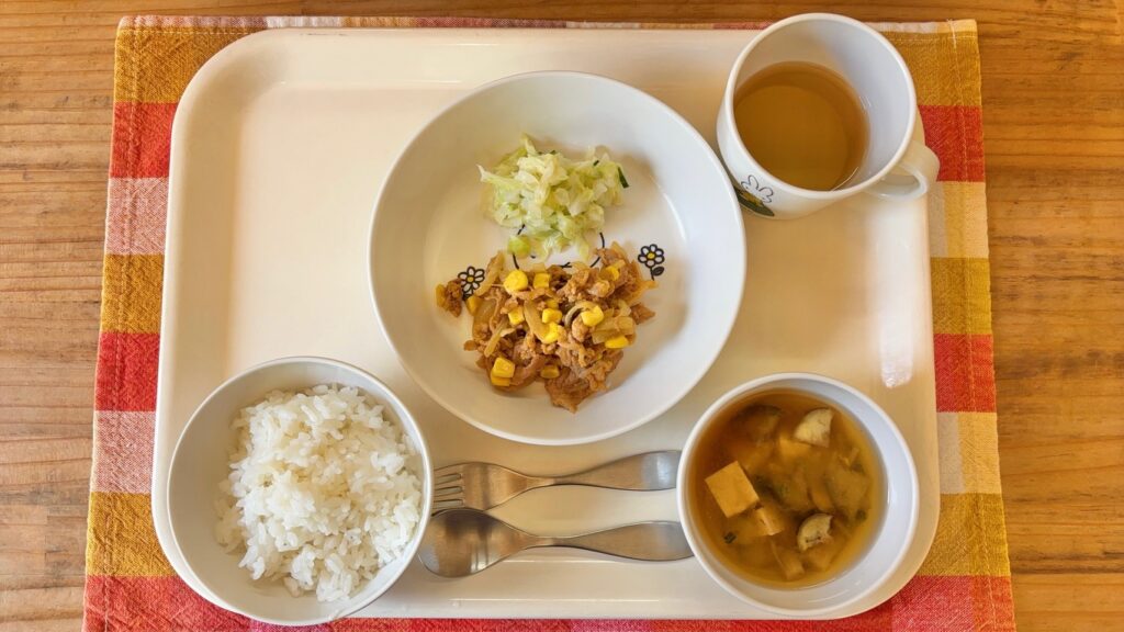 ごはん 豚肉とコーンのカレー炒め コールスローサラダ なすのみそ汁
