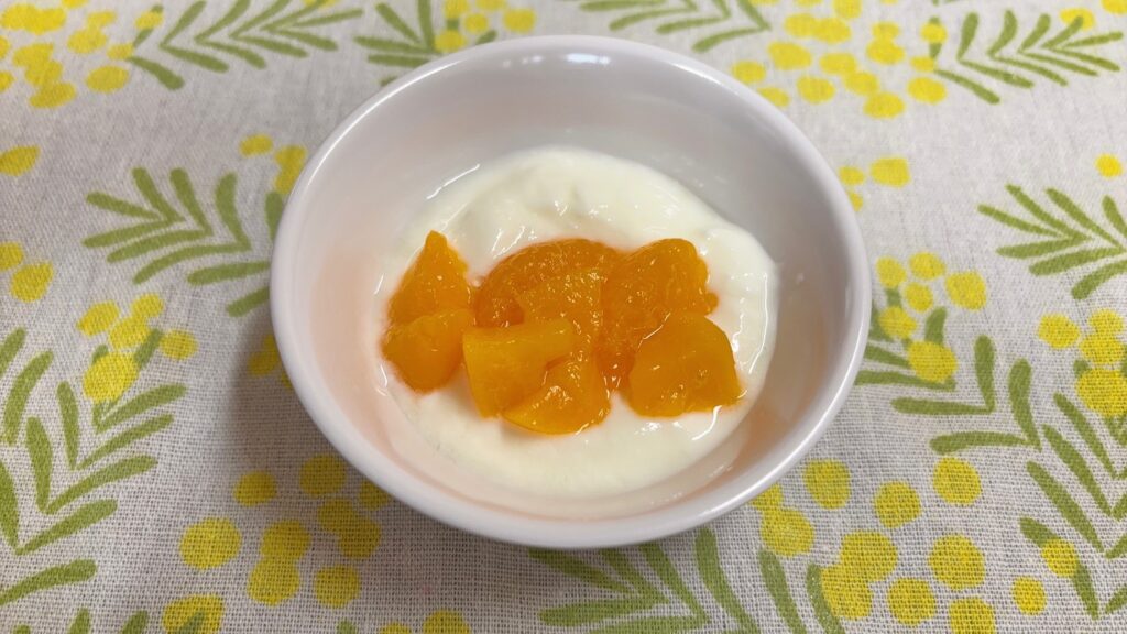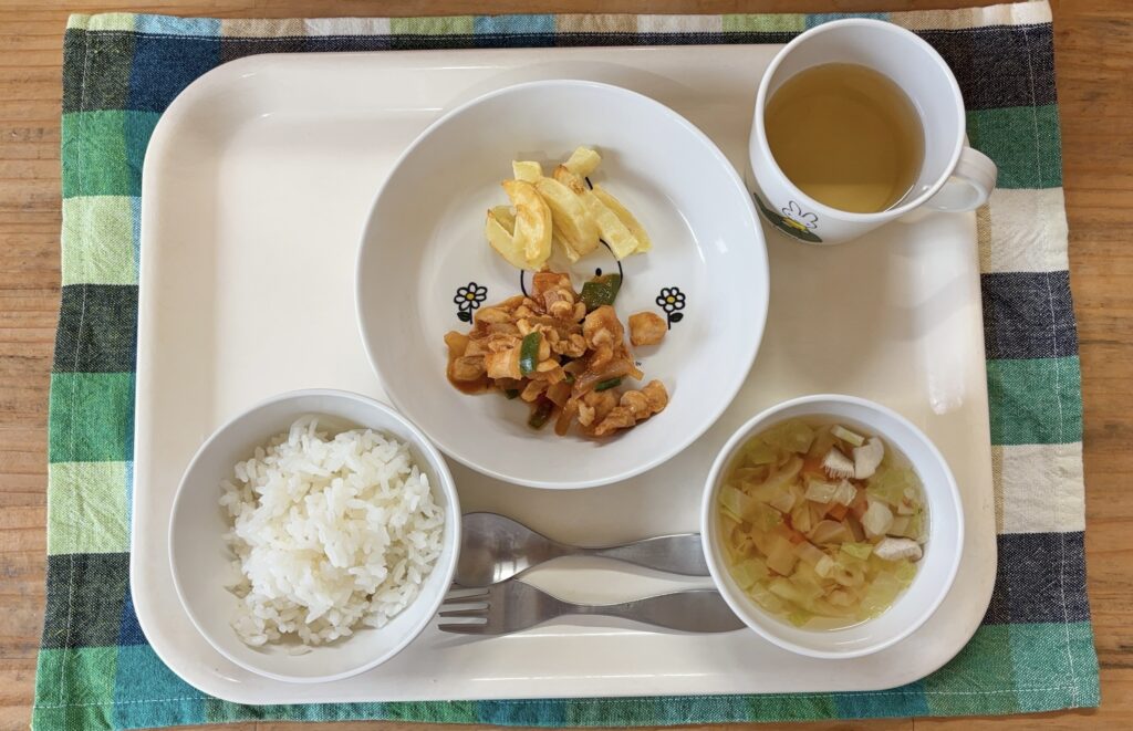 今日のメニュー 10月10日(金) ごはん チキンチャップ じゃが芋スティック揚げ 野菜スープ チキンチャップはこんがり焼いた鶏もも肉に炒めた玉ねぎ・ピーマンを混ぜ合わせ、ケチャップ・ソースで味付けしました。ケチャップの味付けだと食べやすかったのかいつもは残している玉ねぎを「たべれるよ!」と見せてくれる姿がありました。じゃがいもなど、口の中でまとまりやすく食べやすい食材はスティック状で出す事で、自分の一口を知る事ができます。 おやつ フルーツヨーグルト 今日のメニュー 前の記事