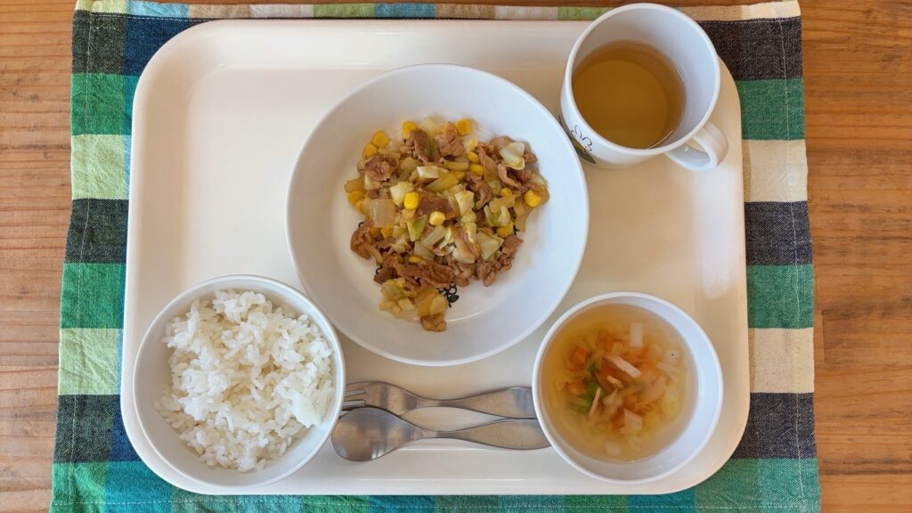 今日のメニュー 10月28日(火) ごはん 豚肉のカレー炒め たっぷり野菜とベーコンのスープ 豚肉のカレー炒めは塩分を抑えながらも、カレーの風味が効いていてご飯がよくすすみます。りすぐみさんも「あーんっ!」と大きな口をあけて食べる、かっこいい姿を見せてくれました。キャベツや玉ねぎもカレー味になっていると食べやすく、ぴかぴかに食べてくれていました。 おやつ ツナマカロニ 今日のメニュー 前の記事 今日のメニュー 次の記事