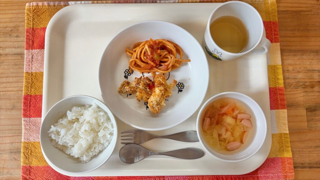 ごはん 鶏肉のパン粉焼き ケチャップスパゲティー 野菜スープ