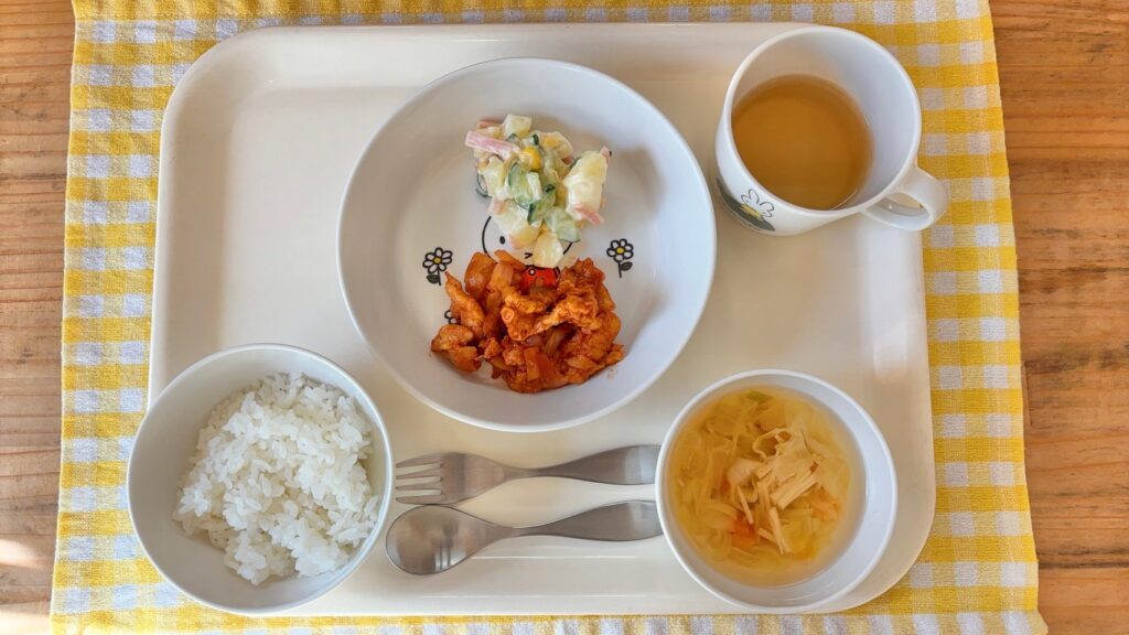 ごはん チキンチャップ ポテトサラダ コンソメスープ