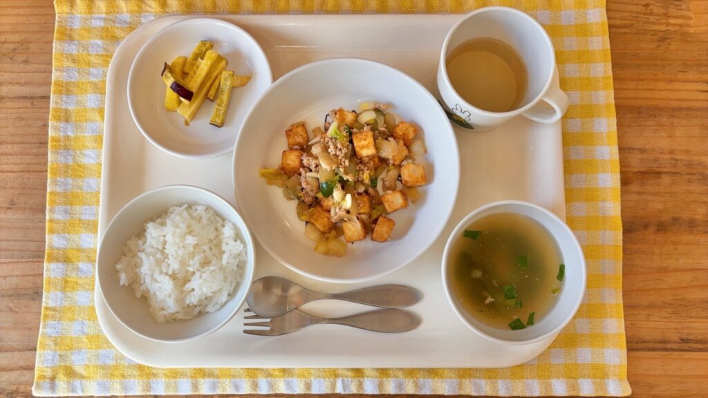 ごはん 厚揚げの中華煮 青菜の中華スープ さつまいもスティック