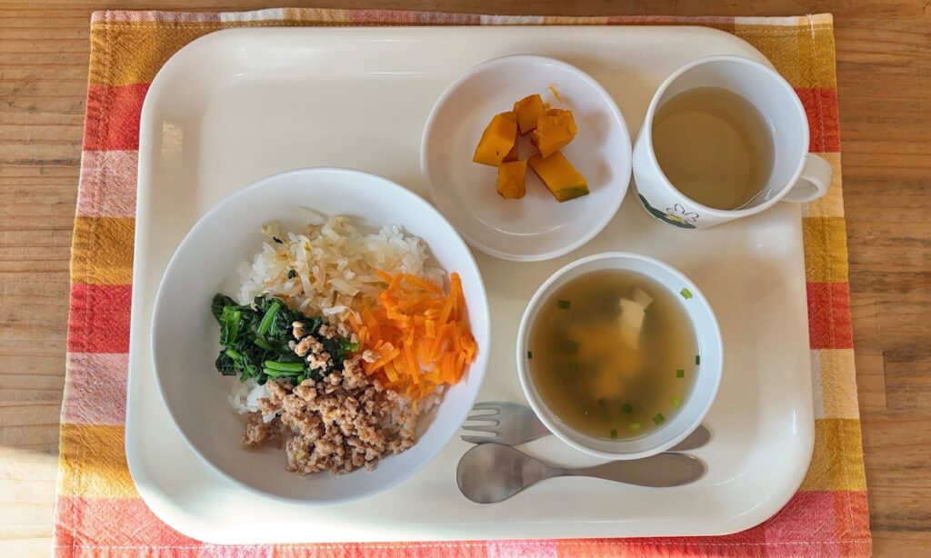 今日のメニュー 11月28日(金) キッズビビンバ 中華スープ かぼちゃの甘煮 子どもたちに人気のキッズビビンバは豚ひき肉をしょうが・しょうゆ・砂糖で甘辛く炒めているのでご飯がすすみます。慣れた手つきで混ぜながら食べる子どもたち。あっという間におかわりもぴかぴかになって「またビビンバでるかなー?」と次に給食で出てくるのを楽しみにしてくれていました。 おやつ 焼き芋 今日のメニュー 前の記事 今日のメニュー 次の記事