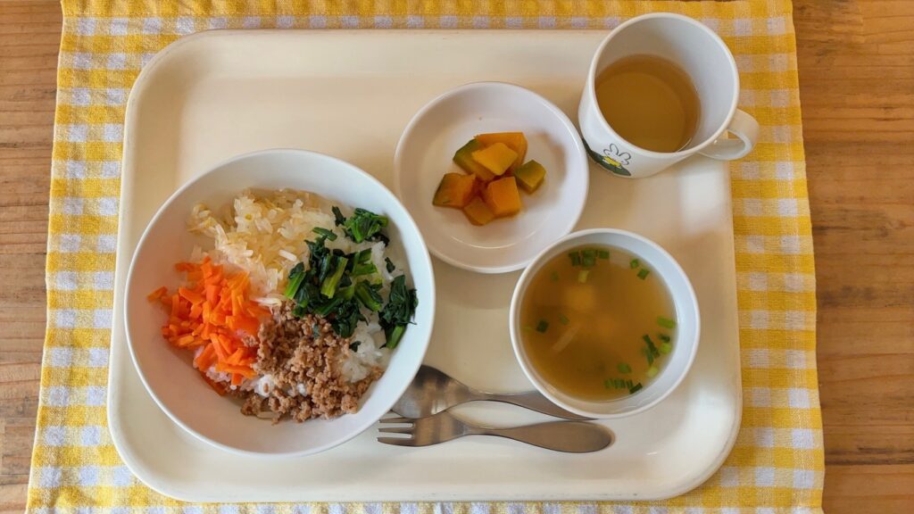 今日のメニュー 1月16日(金) キッズビビンバ 中華スープ かぼちゃの甘煮 かぼちゃの甘煮はβカロテン・ビタミン類・食物繊維・カリウムなどが豊富で風邪予防などに役立ちます。真っ先に大好きなかぼちゃを食べ「おかわりちょうだい!」をする子もいれば、「あれ?かぼちゃ苦手だったかな?」と最初はかぼちゃに手をつけず、最後にかぼちゃを食べる子もいました。好きな物は最初に食べる子、最後に食べる子、食べ方もそれぞれですね。 おやつ ほうれん草とコーンのスパゲティー 今日のメニュー 前の記事 今日のメニュー 次の記事