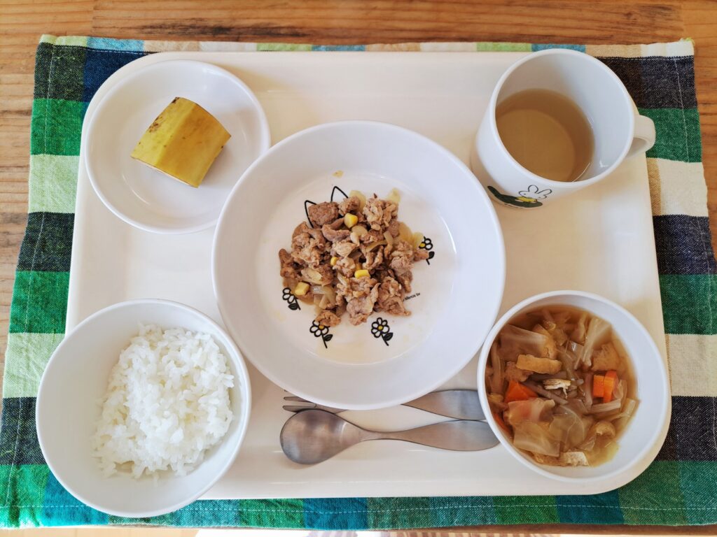 ご飯 たっぷり野菜のすまし汁 豚肉のカレー炒め バナナ