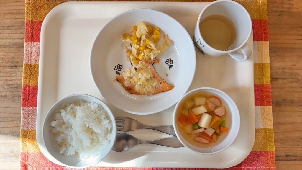 今日のメニュー 1月26日(月) ごはん 魚のマヨドレ焼き キャベツとコーンのソテー じゃがいもとかぼちゃスープ 魚のマヨドレ焼きは、みじん切りにしたたっぷりの玉ねぎとマヨネーズを混ぜ合わせたソースをつけてオーブンで焼きました。玉ねぎの甘みとマヨネーズのコクが鮭とよく合います。身が柔らかくなるので子どもたちにも食べやすくなっています おやつ わかめおにぎり 今日のメニュー 前の記事 今日のメニュー 次の記事