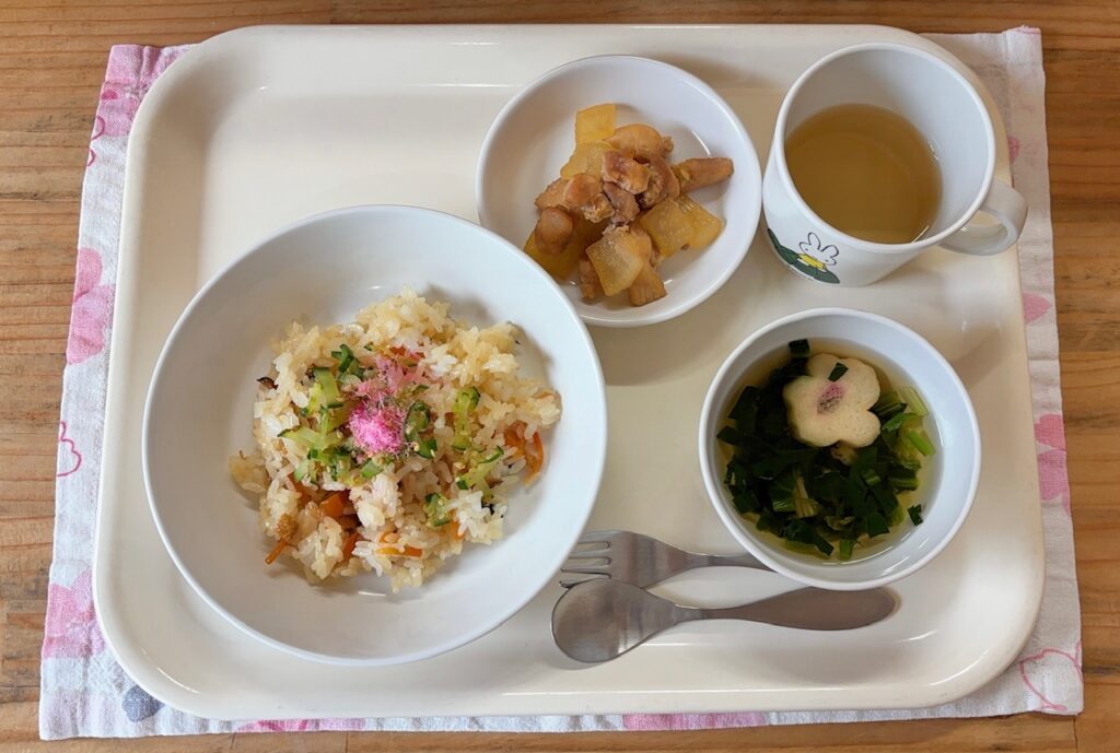 今日のメニュー 3月3日(火) ひな祭り・ちらし寿司 麩のすまし汁 鶏肉の照り焼き ちらし寿司にはピンク色の桜でんぶをまぶし、すまし汁には花麩を使用して、ひな祭りのお祝いをしました。 おやつは蒲郡市ではお馴染みの油菓子です。その歴史は古く、なんと江戸時代から親しまれているそうです。むつみの丘ではベーキングパウダーを少し入れ、硬くなりすぎないよう作りました。「かたかただねぇ。」と言ってる子もいたり、「ドーナツみたい!」と教えてくれたり、みんな「おいしいね!」と満足げな顔でした。 今日のメニュー 前の記事 今日のメニュー 次の記事