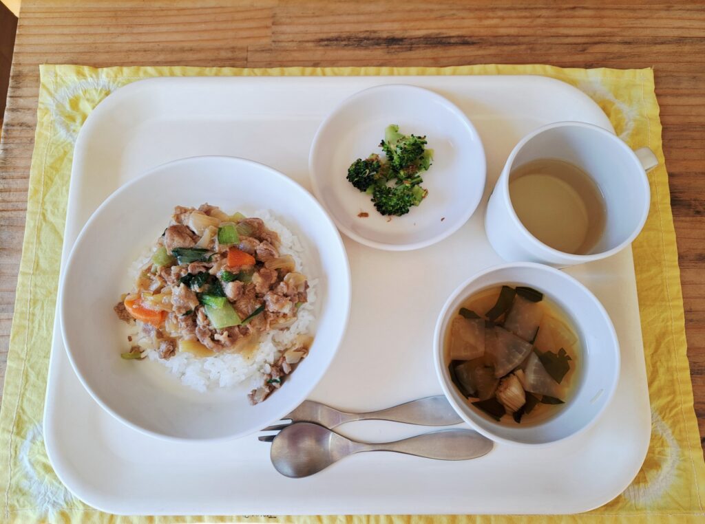 豚肉の甘みそ丼 だいこんのすまし汁 ブロッコリーのおかか和え