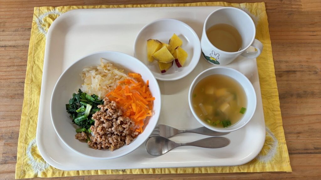 今日のメニュー 3月13日(金) キッズビビンバ 玉ねぎの中華スープ さつま芋のレモン煮 大好きなさつま芋を「みてみて!おっきいよ!」「これは、ちっちゃいね!」とお友だちと楽しそうにお話ししていました。「ビビンバは混ぜ混ぜして食べるんだよ。」と伝えるとみんな「できるよ!」と混ぜ混ぜ。お皿からこぼれないように上手にできていました。 おやつ いちごヨーグルト 今日のメニュー 前の記事 今日のメニュー 次の記事