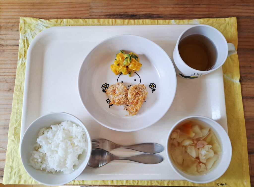 今日のメニュー 3月18日(水) ご飯 カリフラワーのスープ 鶏肉のパン粉焼き かぼちゃのごまサラダ 今日はみんなの好きな鶏肉のパン粉焼きです。パクパク食べて「お肉おかわり!」と大きな声が聞こえました。 スープはカリフラワー、きゃべつ、にんじん、たまねぎ、ウインナーと具がいっぱいのスープ。 メインが唐揚げや、パン粉焼きなど魚、お肉単体になってしまうメニューの時はスープなどの汁物に野菜をたっぷり使うと野菜も一緒に摂ることができますね。 おやつ やきいも 今日のメニュー 前の記事