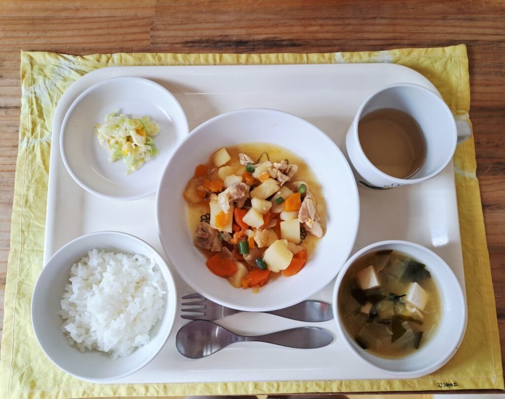 今日のメニュー 3月26日(木) ご飯 みそ汁 鶏肉じゃが キャベツのごまマヨ和え 今日は鶏肉じゃがでした。 野菜の甘みを鶏肉の旨味を感じられるものとなりました。 キャベツのごまマヨ和えはキャベツのシャキシャキ、ごまの香りが楽しめる和え物でした。シャキシャキ食べられたかな? おやつ りんごマフィン 今日のメニュー 前の記事 今日のメニュー 次の記事