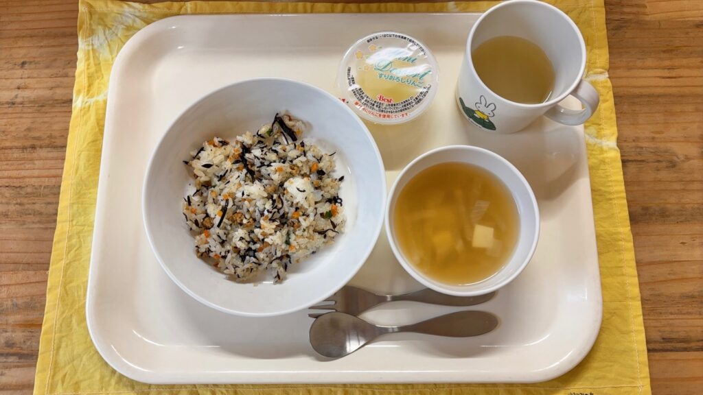 今日のメニュー 3月31日(火) ひじきご飯 中華スープ ミニゼリー 早いもので今年度最後の給食、おやつです。うめぐみさんは「むつみさん、きょうでさいごなんだ。」「あしたからは〇〇にいくよ!」と新しい生活をとても楽しみにしています。そんな立派な姿を見て「大きくなったね。」としみじみしていました。 保護者の皆様にも温かいお言葉をいただき、感謝でいっぱいです。ありがとうございました。 明日からの来年度もよろしくお願いいたします。 おやつ クラッカーサンド(ジャム) 今日のメニュー 前の記事 今日のメニュー 次の記事