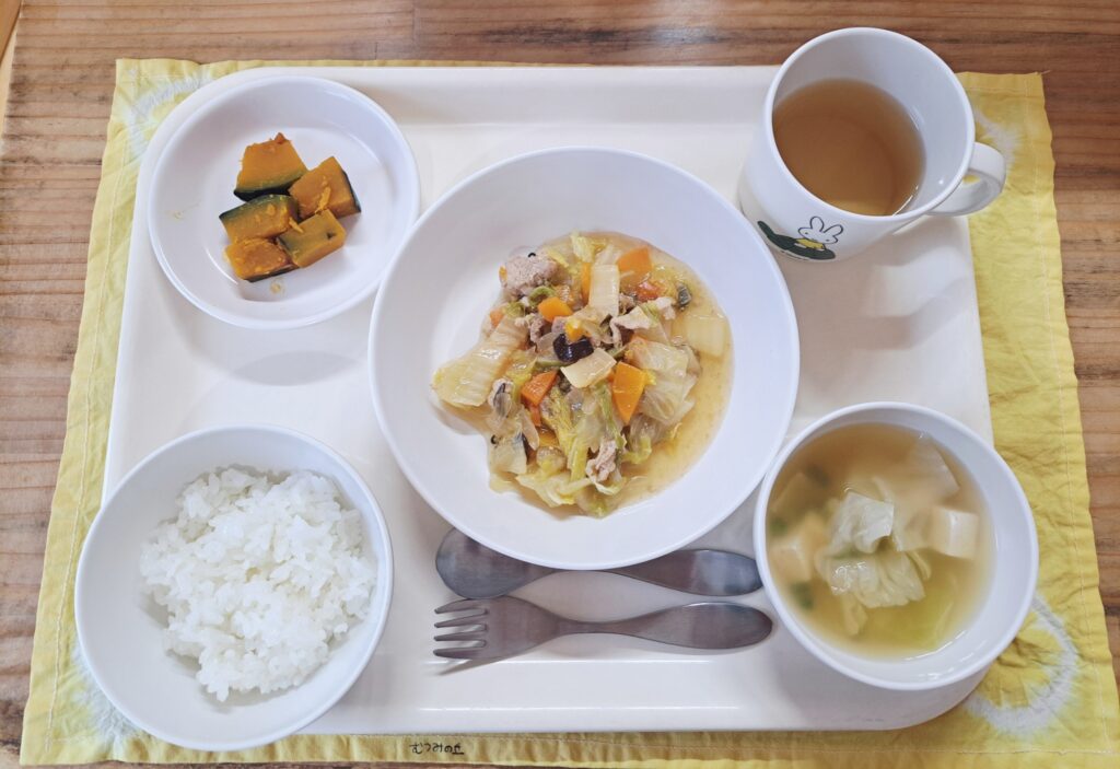 今日は八宝菜です。たっぷりの白菜、豚肉、にんじん、しいたけ、たまねぎが入っていました。